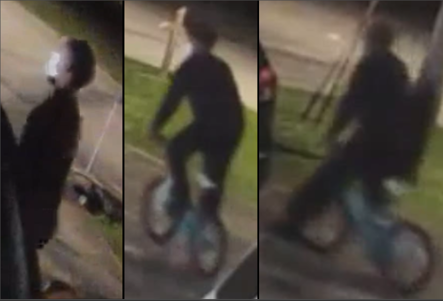 The suspect was recorded on security video and can only be described as a white male. He was riding on a small, teal-colored BMX style bicycle with a white seat. The bike may be a girl's version.