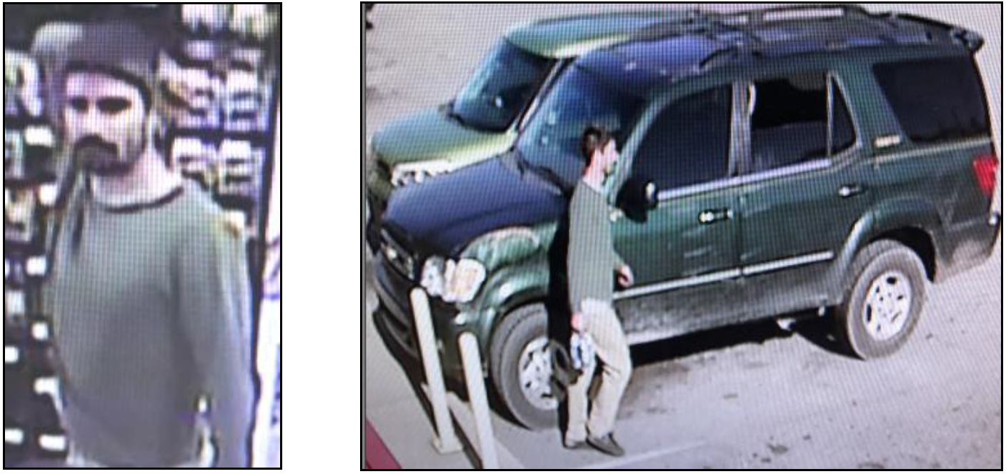 Suspect and vehicleThe suspect is described as a white male, tall, thin, dark brown hair and dark beard. The vehicle he left in is an older model, green Toyota Sequoia with a large dent on the front driver side quarter panel, and possible scratch marks on the driver's door.