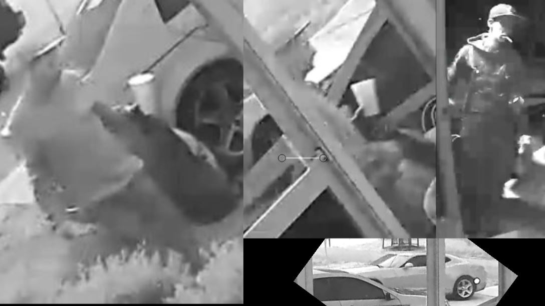 Security video captured a white male arriving in a Chevy Camaro (driven by another person). The unknown man gets into the victim's vehicle. Another video captured a white male coming into the victim's front porch after arriving on a bicycle.